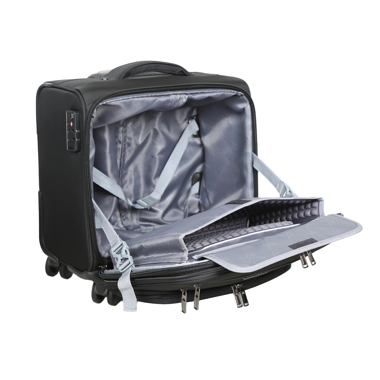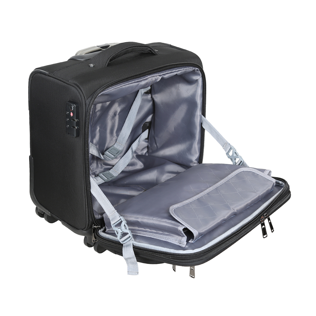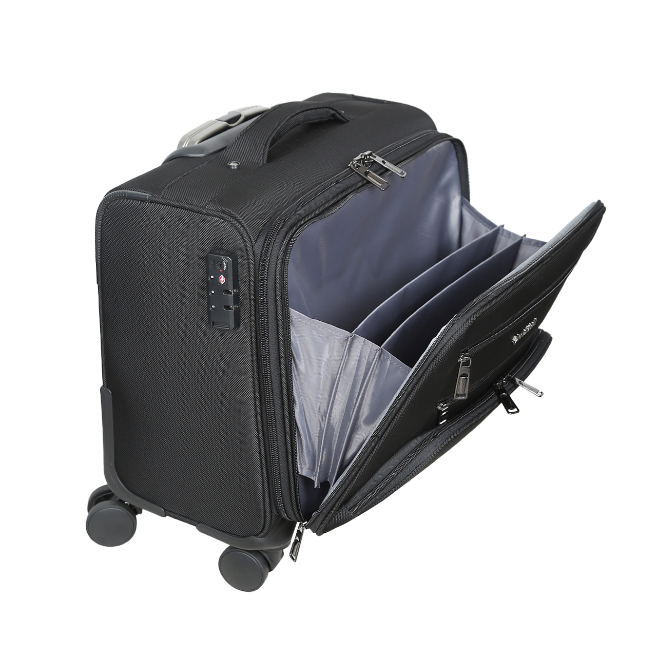 کیف خلبانی (پرواز) پرزیدنت مدل "SBP12780-17" دارای رنگ مشکی تجسمی از شیکپوشی و کارآمدی که با کیفیت عالی به صورت سفارشی در ایران مونتاژ شده است. طراحی زیبا و وزن سبک آن را به همراهی ایدهآل برای سفرهای کاری و روزانه تبدیل کرده است. جنس باکیفیت و محفظههای متعدد، سازماندهی وسایل شما را آسان و سریع میکند. از طراحی بسیار زیبای این محصول که بگذریم، جنس این محصول از پارچه جودون با تراکم بافت بالا، بسیار مقاوم و محکم می باشد. دسته ترولی این محصول چهار استپ با طراحی بسیار مناسب از جنس آلیاژ مرغوب آلومینیوم ساخته شده است که بسیار مقاوم می باشد. چرخ های این محصول از جنس مواد پلاستیک و PU بوده که فوق العاده روان هستند و به صورت چهار چرخ گردان دبل 360 می باشد. زیپ اصلی این محصول نمره ده دوبل می باشد و دارای قفل رمزی TSA می باشد. طراحی داخلی این محصول بسیار شیک از آستر پلی استر می باشد و در قسمت درب آن یک فضای جای لپ تاپ حباب دار تا سایز 15 اینچ (35*25 سانتی متر) وجود دارد و در کناره ها در هر طرف یک بند وجود دارد که توسط سگک باز و بسته می شود که قسمت درب فضای اصلی زمانی که بندها بسته باشد مانع از رسیدن درب به زمین می شود. در قسمت جلوی کیف خلبانی پرزیدنت یک فضای زیپ دار وجود دارد که داخل آن پارتیشن دارد که به راحتی می توانید لوازم خود را به صورت تفکیکی بگذارید و جیب های جلو این امکان را می دهد که لوازم خرده ریز به راحتی در دسترس شما باشد. دسته بالای این محصول بسیار راحت و محکم و مقاوم که علاوه بر دوخت پرچ هم خورده است. این محصول مناسب برای سفرهای اداری و کوتاه و بهترین گزینه برای داخل کابین هواپیما می باشد. وزن این محصول 3600 گرم می باشد.